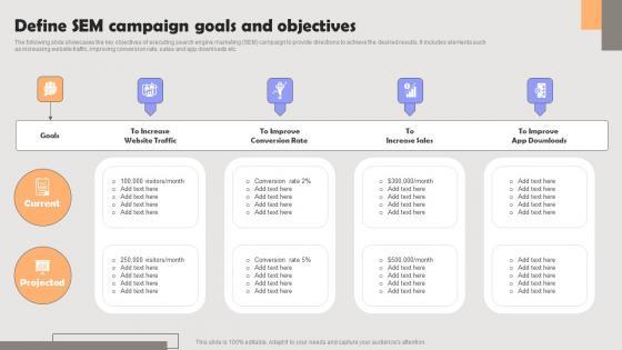 The following slide showcases the key objectives of executing search engine marketing SEM campaign to provide directions to achieve the desired results. It includes elements such as increasing website traffic, improving conversion rate, sales and app downloads etc. Whether you have daily or monthly meetings, a brilliant presentation is necessary. Improving PPC Campaign Results Define Sem Campaign Goals And Objectives Template Pdf can be your best option for delivering a presentation. Represent everything in detail using Improving PPC Campaign Results Define Sem Campaign Goals And Objectives Template Pdf and make yourself stand out in meetings. The template is versatile and follows a structure that will cater to your requirements. All the templates prepared by Slidegeeks are easy to download and edit. Our research experts have taken care of the corporate themes as well. So, give it a try and see the results. The following slide showcases the key objectives of executing search engine marketing SEM campaign to provide directions to achieve the desired results. It includes elements such as increasing website traffic, improving conversion rate, sales and app downloads etc.
