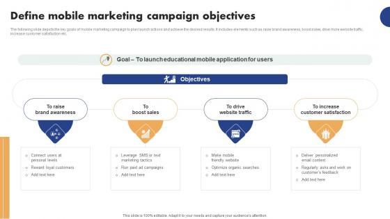 The following slide depicts the key goals of mobile marketing campaign to plan launch actions and achieve the desired results. It includes elements such as raise brand awareness, boost sales, drive more website traffic, increase customer satisfaction etc. There are so many reasons you need a Mobile Ad Campaign Launch Strategy Define Mobile Marketing Campaign Objectives Microsoft Pdf. The first reason is you can not spend time making everything from scratch, Thus, Slidegeeks has made presentation templates for you too. You can easily download these templates from our website easily. The following slide depicts the key goals of mobile marketing campaign to plan launch actions and achieve the desired results. It includes elements such as raise brand awareness, boost sales, drive more website traffic, increase customer satisfaction etc.