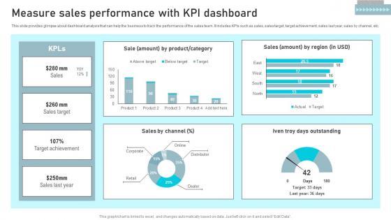This slide provides glimpse about dashboard analysis that can help the business to track the performance of the sales team. It includes KPIs such as sales, sales target, target achievement, sales last year, sales by channel, etc. The Measure Sales Performance With Business Sales Enhancement Campaign Inspiration Pdf is a compilation of the most recent design trends as a series of slides. It is suitable for any subject or industry presentation, containing attractive visuals and photo spots for businesses to clearly express their messages. This template contains a variety of slides for the user to input data, such as structures to contrast two elements, bullet points, and slides for written information. Slidegeeks is prepared to create an impression. This slide provides glimpse about dashboard analysis that can help the business to track the performance of the sales team. It includes KPIs such as sales, sales target, target achievement, sales last year, sales by channel, etc.