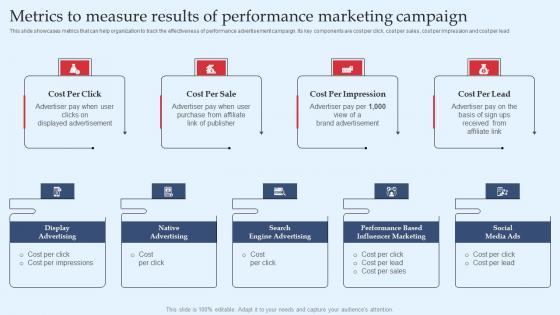 This slide showcases metrics that can help organization to track the effectiveness of performance advertisement campaign. Its key components are cost per click, cost per sales, cost per impression and cost per lead. Retrieve professionally designed Strategic Performance Marketing Campaign Metrics To Measure Results Of Performance Themes Pdf to effectively convey your message and captivate your listeners. Save time by selecting pre-made slideshows that are appropriate for various topics, from business to educational purposes. These themes come in many different styles, from creative to corporate, and all of them are easily adjustable and can be edited quickly. Access them as PowerPoint templates or as Google Slides themes. You do not have to go on a hunt for the perfect presentation because Slidegeeks got you covered from everywhere. This slide showcases metrics that can help organization to track the effectiveness of performance advertisement campaign. Its key components are cost per click, cost per sales, cost per impression and cost per lead.