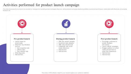 This slide showcases the key tasks to be executed by managers for marketing product campaigns. Major pre, during and post-campaign advertising activities covered are launch teaser, collaboration with influencers, encouraging feedback, etc. Find a pre-designed and impeccable Activities Performed For Product Launch Campaign Digital Promotional Campaign Topics Pdf. The templates can ace your presentation without additional effort. You can download these easy-to-edit presentation templates to make your presentation stand out from others. So, what are you waiting for Download the template from Slidegeeks today and give a unique touch to your presentation. This slide showcases the key tasks to be executed by managers for marketing product campaigns. Major pre, during and post-campaign advertising activities covered are launch teaser, collaboration with influencers, encouraging feedback, etc.