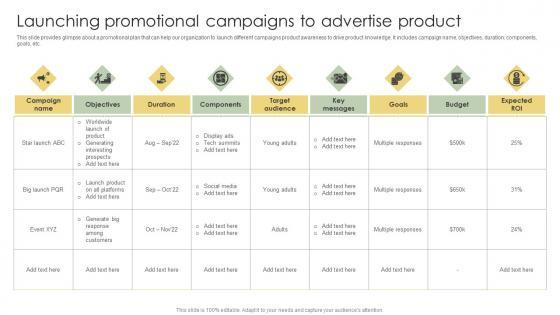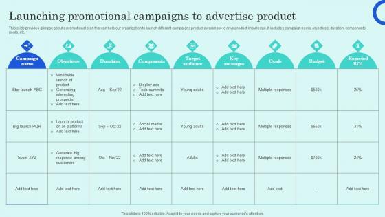 This slide provides glimpse about a promotional plan that can help our organization to launch different campaigns product awareness to drive product knowledge. It includes campaign name, objectives, duration, components, goals, etc. Slidegeeks is one of the best resources for PowerPoint templates. You can download easily and regulate Implementing Client Onboarding Process Launching Promotional Campaigns To Advertise Product Slides PDF for your personal presentations from our wonderful collection. A few clicks is all it takes to discover and get the most relevant and appropriate templates. Use our Templates to add a unique zing and appeal to your presentation and meetings. All the slides are easy to edit and you can use them even for advertisement purposes.