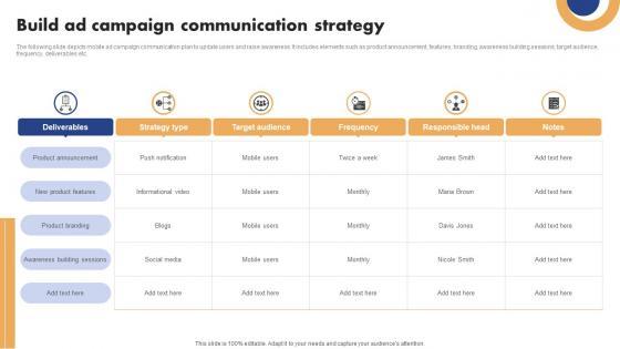 The following slide depicts mobile ad campaign communication plan to update users and raise awareness. It includes elements such as product announcement, features, branding, awareness building sessions, target audience, frequency, deliverables etc. Slidegeeks is one of the best resources for PowerPoint templates. You can download easily and regulate Mobile Ad Campaign Launch Strategy Build Ad Campaign Communication Strategy Icons Pdf for your personal presentations from our wonderful collection. A few clicks is all it takes to discover and get the most relevant and appropriate templates. Use our Templates to add a unique zing and appeal to your presentation and meetings. All the slides are easy to edit and you can use them even for advertisement purposes. The following slide depicts mobile ad campaign communication plan to update users and raise awareness. It includes elements such as product announcement, features, branding, awareness building sessions, target audience, frequency, deliverables etc.
