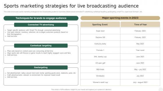 This slide showcases sports marketing strategies for live broadcasting audience. It provides details about connected TV advertising, contextual targeting, geotargeting, smart TVs, super bowl, formula 1, etc. Do you have to make sure that everyone on your team knows about any specific topic I yes, then you should give Sports Marketing Strategies For Live Broadcasting Audience In Depth Campaigning Guide a try. Our experts have put a lot of knowledge and effort into creating this impeccable Sports Marketing Strategies For Live Broadcasting Audience In Depth Campaigning Guide You can use this template for your upcoming presentations, as the slides are perfect to represent even the tiniest detail. You can download these templates from the Slidegeeks website and these are easy to edit. So grab these today This slide showcases sports marketing strategies for live broadcasting audience. It provides details about connected TV advertising, contextual targeting, geotargeting, smart TVs, super bowl, formula 1, etc.
