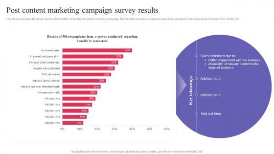 This slide showcases the survey results obtained after conducting the content marketing campaign. The benefits covered are increased sales, lead generation, brand awareness, improved SEO ranking, etc. Want to ace your presentation in front of a live audience Our Post Content Marketing Campaign Survey Results Information PDF can help you do that by engaging all the users towards you.. Slidegeeks experts have put their efforts and expertise into creating these impeccable powerpoint presentations so that you can communicate your ideas clearly. Moreover, all the templates are customizable, and easy-to-edit and downloadable. Use these for both personal and commercial use.