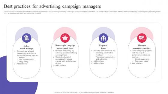 This slide depicts the best practices to be adopted by marketers for conducting marketing campaigns to capture audience attention. The best practices covered are defining the brand message, choosing the right management tools, empowering the team and measuring analytics. Create an editable Advertising Programs Management Techniques Best Practices For Advertising Campaign Managers Formats PDF that communicates your idea and engages your audience. Whether youre presenting a business or an educational presentation, pre designed presentation templates help save time. Advertising Programs Management Techniques Best Practices For Advertising Campaign Managers Formats PDF is highly customizable and very easy to edit, covering many different styles from creative to business presentations. Slidegeeks has creative team members who have crafted amazing templates. So, go and get them without any delay.