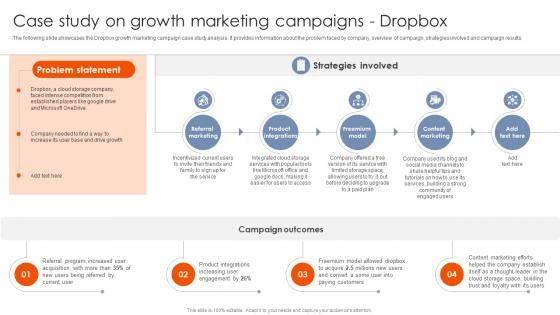 The following slide showcases the Dropbox growth marketing campaign case study analysis. It provides information about the problem faced by company, overview of campaign, strategies involved and campaign results. The Case Study On Growth Marketing Campaigns Dropbox Best Practices For Using MKT SS V is a compilation of the most recent design trends as a series of slides. It is suitable for any subject or industry presentation, containing attractive visuals and photo spots for businesses to clearly express their messages. This template contains a variety of slides for the user to input data, such as structures to contrast two elements, bullet points, and slides for written information. Slidegeeks is prepared to create an impression. The following slide showcases the Dropbox growth marketing campaign case study analysis. It provides information about the problem faced by company, overview of campaign, strategies involved and campaign results.