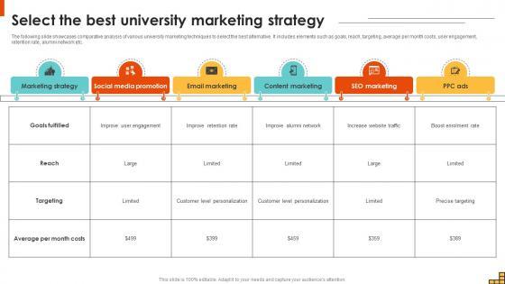 The following slide showcases comparative analysis of various university marketing techniques to select the best alternative. It includes elements such as goals, reach, targeting, average per month costs, user engagement, retention rate, alumni network etc. Presenting this PowerPoint presentation, titled Select The Best University Marketing Strategy Running Marketing Campaigns Strategy SS V, with topics curated by our researchers after extensive research. This editable presentation is available for immediate download and provides attractive features when used. Download now and captivate your audience. Presenting this Select The Best University Marketing Strategy Running Marketing Campaigns Strategy SS V. Our researchers have carefully researched and created these slides with all aspects taken into consideration. This is a completely customizable Select The Best University Marketing Strategy Running Marketing Campaigns Strategy SS V that is available for immediate downloading. Download now and make an impact on your audience. Highlight the attractive features available with our PPTs. The following slide showcases comparative analysis of various university marketing techniques to select the best alternative. It includes elements such as goals, reach, targeting, average per month costs, user engagement, retention rate, alumni network etc.