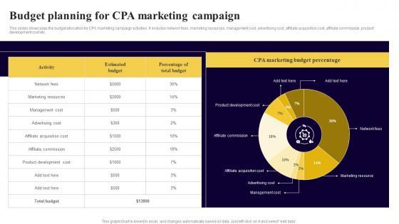 This slides showcases the budget allocation for CPA marketing campaign activities. It includes network fees, marketing resources, management cost, advertising cost, affiliate acquisition cost, affiliate commission, product development cost etc. There are so many reasons you need a Budget Planning For CPA Marketing Campaign Executing Cost Per Action Marketing Microsoft Pdf. The first reason is you can not spend time making everything from scratch, Thus, Slidegeeks has made presentation templates for you too. You can easily download these templates from our website easily. This slides showcases the budget allocation for CPA marketing campaign activities. It includes network fees, marketing resources, management cost, advertising cost, affiliate acquisition cost, affiliate commission, product development cost etc.