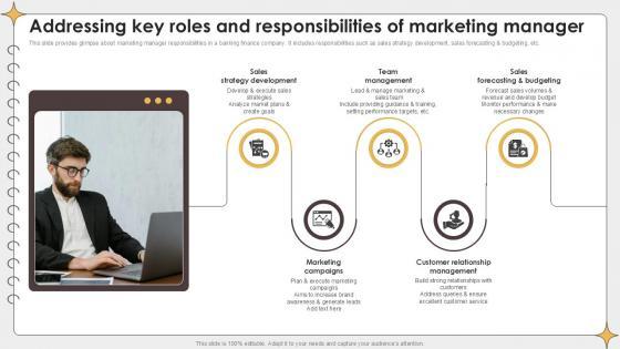 This slide provides glimpse about marketing manager responsibilities in a banking finance company. It includes responsibilities such as sales strategy development, sales forecasting and budgeting, etc. Find a pre-designed and impeccable Addressing Key Roles And Responsibilities Planning Outreach Campaigns PPT PowerPoint. The templates can ace your presentation without additional effort. You can download these easy-to-edit presentation templates to make your presentation stand out from others. So, what are you waiting for Download the template from Slidegeeks today and give a unique touch to your presentation. This slide provides glimpse about marketing manager responsibilities in a banking finance company. It includes responsibilities such as sales strategy development, sales forecasting and budgeting, etc.