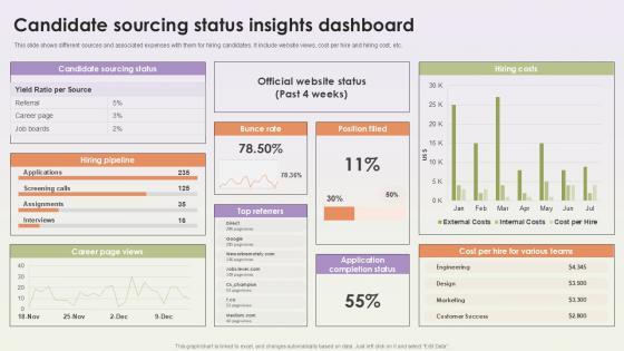This slide shows different sources and associated expenses with them for hiring candidates. It include website views, cost per hire and hiring cost, etc. Slidegeeks is one of the best resources for PowerPoint templates. You can download easily and regulate Candidate Sourcing Status Insights Dashboard Workforce Procurement And Aptitude Evaluation Ppt Sample for your personal presentations from our wonderful collection. A few clicks is all it takes to discover and get the most relevant and appropriate templates. Use our Templates to add a unique zing and appeal to your presentation and meetings. All the slides are easy to edit and you can use them even for advertisement purposes. This slide shows different sources and associated expenses with them for hiring candidates. It include website views, cost per hire and hiring cost, etc.