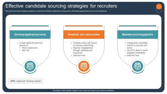 This slide showcases strategies adopted by companies for effective applicant sourcing such as developing applicant persons, job communities etc. Find a pre-designed and impeccable A75 Strategic Staffing Using Data Driven Effective Candidate Sourcing Strategies CRP DK SS V. The templates can ace your presentation without additional effort. You can download these easy-to-edit presentation templates to make your presentation stand out from others. So, what are you waiting for Download the template from Slidegeeks today and give a unique touch to your presentation. This slide showcases strategies adopted by companies for effective applicant sourcing such as developing applicant persons, job communities etc.