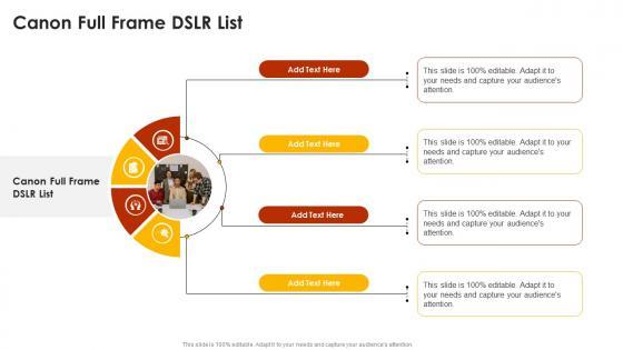 Introducing our well designed Canon Full Frame Dslr List In Powerpoint And Google Slides Cpb. This PowerPoint design presents information on topics like Canon Full Frame Dslr List. As it is predesigned it helps boost your confidence level. It also makes you a better presenter because of its high quality content and graphics. This PPT layout can be downloaded and used in different formats like PDF, PNG, and JPG. Not only this, it is available in both Standard Screen and Widescreen aspect ratios for your convenience. Therefore, click on the download button now to persuade and impress your audience. Our Canon Full Frame Dslr List In Powerpoint And Google Slides Cpb are topically designed to provide an attractive backdrop to any subject. Use them to look like a presentation pro.