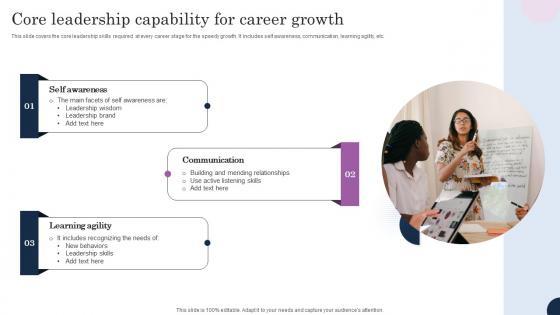 This slide covers the core leadership skills required at every career stage for the speedy growth. It includes self awareness, communication, learning agility, etc.Showcasing this set of slides titled Core Leadership Capability For Career Growth Microsoft Pdf The topics addressed in these templates are Self Awareness, Communication, Learning Agility All the content presented in this PPT design is completely editable. Download it and make adjustments in color, background, font etc. as per your unique business setting. This slide covers the core leadership skills required at every career stage for the speedy growth. It includes self awareness, communication, learning agility, etc.