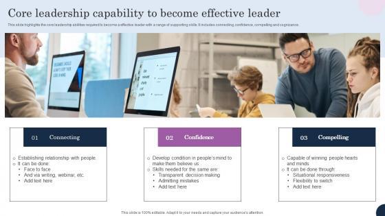 This slide highlights the core leadership abilities required to become a effective leader with a range of supporting skills. It includes connecting, confidence, compelling and cognizance. Pitch your topic with ease and precision using this Core Leadership Capability To Become Effective Leader Mockup Pdf This layout presents information on Establishing Relationship, Develop Condition, Transparent Decision It is also available for immediate download and adjustment. So, changes can be made in the color, design, graphics or any other component to create a unique layout. This slide highlights the core leadership abilities required to become a effective leader with a range of supporting skills. It includes connecting, confidence, compelling and cognizance.