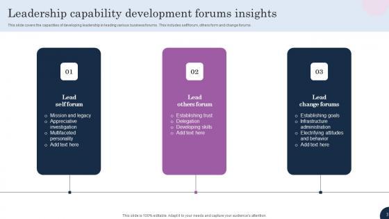 This slide covers the capacities of developing leadership in leading various business forums . This includes self forum, others form and change forums.Pitch your topic with ease and precision using this Leadership Capability Development Forums Insights Inspiration Pdf This layout presents information on Lead Self Forum, Lead Others Forum, Lead Change Forums It is also available for immediate download and adjustment. So, changes can be made in the color, design, graphics or any other component to create a unique layout. This slide covers the capacities of developing leadership in leading various business forums . This includes self forum, others form and change forums.