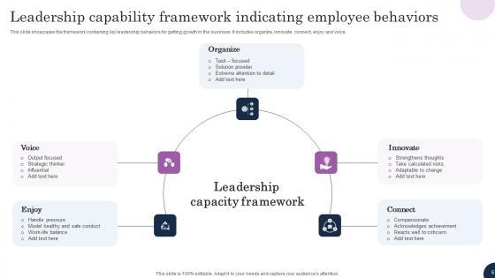 This slide showcases the framework containing key leadership behaviors for getting growth in the business. It includes organize, innovate, connect, enjoy and voice. Showcasing this set of slides titled Leadership Capability Framework Indicating Employee Behaviors Mockup Pdf The topics addressed in these templates are Handle Pressure, Output Focused, Extreme Attention All the content presented in this PPT design is completely editable. Download it and make adjustments in color, background, font etc. as per your unique business setting. This slide showcases the framework containing key leadership behaviors for getting growth in the business. It includes organize, innovate, connect, enjoy and voice.