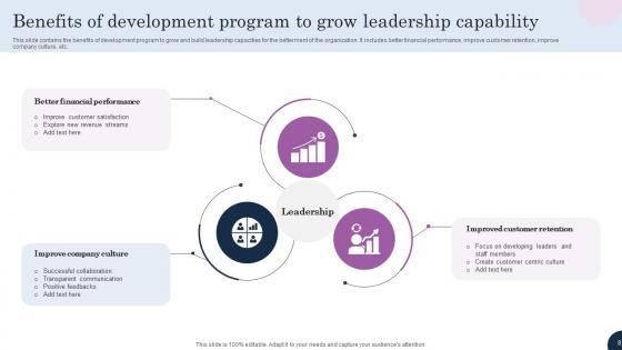 This slide contains the benefits of development program to grow and build leadership capacities for the betterment of the organization. It includes better financial performance, improve customer retention, improve company culture, etc.Showcasing this set of slides titled Benefits Of Development Program To Grow Leadership Capability Mockup Pdf The topics addressed in these templates are Better Financial Performance, Improve Company Culture, Improved Customer Retention All the content presented in this PPT design is completely editable. Download it and make adjustments in color, background, font etc. as per your unique business setting. This slide contains the benefits of development program to grow and build leadership capacities for the betterment of the organization. It includes better financial performance, improve customer retention, improve company culture, etc.