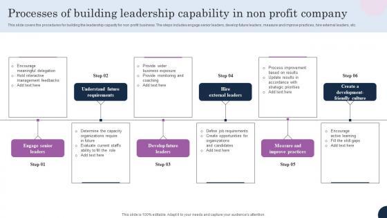 This slide covers the procedures for building the leadership capacity for non profit business. The steps includes engage senior leaders, develop future leaders, measure and improve practices, hire external leaders, etc. Pitch your topic with ease and precision using this Processes Of Building Leadership Capability In Non Profit Company Sample Pdf This layout presents information on Engage Senior Leaders, Develop Future Leaders, Measure Improve Practices It is also available for immediate download and adjustment. So, changes can be made in the color, design, graphics or any other component to create a unique layout. This slide covers the procedures for building the leadership capacity for non profit business. The steps includes engage senior leaders, develop future leaders, measure and improve practices, hire external leaders, etc.