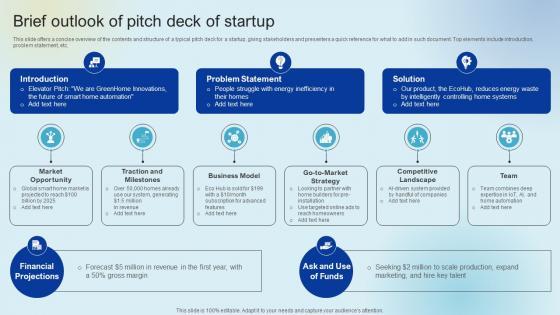 This slide offers a concise overview of the contents and structure of a typical pitch deck for a startup, giving stakeholders and presenters a quick reference for what to add in such document. Top elements include introduction, problem statement, etc. Do you have to make sure that everyone on your team knows about any specific topic I yes, then you should give Brief Outlook Of Pitch Deck Of Startup Raising Venture Capital A Holistic Approach Fin SS V a try. Our experts have put a lot of knowledge and effort into creating this impeccable Brief Outlook Of Pitch Deck Of Startup Raising Venture Capital A Holistic Approach Fin SS V. You can use this template for your upcoming presentations, as the slides are perfect to represent even the tiniest detail. You can download these templates from the Slidegeeks website and these are easy to edit. So grab these today This slide offers a concise overview of the contents and structure of a typical pitch deck for a startup, giving stakeholders and presenters a quick reference for what to add in such document. Top elements include introduction, problem statement, etc.