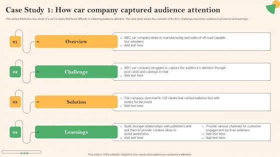 This slide exhibits the case study of a car company that faced difficulty in obtaining audience attention. The case study covers the overview of the firm, challenges faced key solutions to problems and learnings. Get a simple yet stunning designed Social Media Marketing To Boost Case Study 1 How Car Company Captured Audience Summary Pdf. It is the best one to establish the tone in your meetings. It is an excellent way to make your presentations highly effective. So, download this PPT today from Slidegeeks and see the positive impacts. Our easy-to-edit Social Media Marketing To Boost Case Study 1 How Car Company Captured Audience Summary Pdf can be your go-to option for all upcoming conferences and meetings. So, what are you waiting for Grab this template today. This slide exhibits the case study of a car company that faced difficulty in obtaining audience attention. The case study covers the overview of the firm, challenges faced key solutions to problems and learnings.