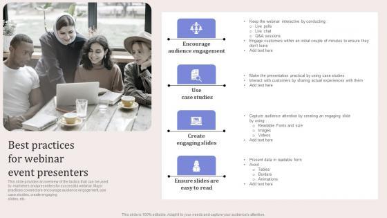This slide provides an overview of the tactics that can be used by marketers and presenters for successful webinar. Major practices covered are encourage audience engagement, use case studies, create engaging slides, etc. Want to ace your presentation in front of a live audience Our Best Practices For Webinar Event Presenters Virtual Event Promotion To Capture Elements Pdf can help you do that by engaging all the users towards you. Slidegeeks experts have put their efforts and expertise into creating these impeccable powerpoint presentations so that you can communicate your ideas clearly. Moreover, all the templates are customizable, and easy-to-edit and downloadable. Use these for both personal and commercial use. This slide provides an overview of the tactics that can be used by marketers and presenters for successful webinar. Major practices covered are encourage audience engagement, use case studies, create engaging slides, etc.