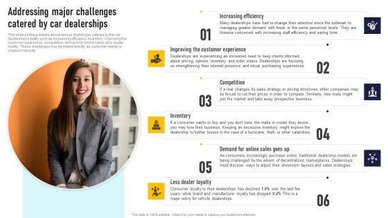 This slide portrays details about various challenges catered by the car dealership industry such as increasing efficiency, inventory, improving the customer experience, competition, demand for online sales, less dealer loyalty. These challenges may be stated directly as customer needs or implied indirectly. This Addressing Major Challenges Catered By Car Dealerships Auto Dealership Business Plan Pictures Pdf is perfect for any presentation, be it in front of clients or colleagues. It is a versatile and stylish solution for organizing your meetings. The Addressing Major Challenges Catered By Car Dealerships Auto Dealership Business Plan Pictures Pdf features a modern design for your presentation meetings. The adjustable and customizable slides provide unlimited possibilities for acing up your presentation. Slidegeeks has done all the homework before launching the product for you. So, do not wait, grab the presentation templates today This slide portrays details about various challenges catered by the car dealership industry such as increasing efficiency, inventory, improving the customer experience, competition, demand for online sales, less dealer loyalty. These challenges may be stated directly as customer needs or implied indirectly.
