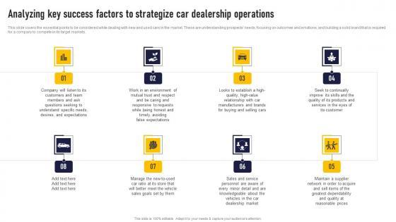 This slide covers the essential points to be considered while dealing with new and used cars in the market. These are understanding prospects needs, focusing on outcomes and emotions, and building a solid brand that is required for a company to compete in its target markets. Explore a selection of the finest Analyzing Key Success Factors To Strategize Car Dealership Auto Dealership Business Plan Microsoft Pdf here. With a plethora of professionally designed and pre-made slide templates, you can quickly and easily find the right one for your upcoming presentation. You can use our Analyzing Key Success Factors To Strategize Car Dealership Auto Dealership Business Plan Microsoft Pdf to effectively convey your message to a wider audience. Slidegeeks has done a lot of research before preparing these presentation templates. The content can be personalized and the slides are highly editable. Grab templates today from Slidegeeks. This slide covers the essential points to be considered while dealing with new and used cars in the market. These are understanding prospects needs, focusing on outcomes and emotions, and building a solid brand that is required for a company to compete in its target markets.