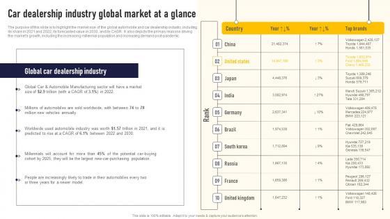 The purpose of this slide is to highlight the market size of the global automobile and car dealership industry, including its share in 2021 and 2022, its forecasted value in 2030, and its CAGR. It also depicts the primary reasons driving the markets growth, including the increasing millennial population and increasing demand post-pandemic. Retrieve professionally designed Car Dealership Industry Global Market At A Glance Auto Dealership Business Plan Download Pdf to effectively convey your message and captivate your listeners. Save time by selecting pre-made slideshows that are appropriate for various topics, from business to educational purposes. These themes come in many different styles, from creative to corporate, and all of them are easily adjustable and can be edited quickly. Access them as PowerPoint templates or as Google Slides themes. You do not have to go on a hunt for the perfect presentation because Slidegeeks got you covered from everywhere. The purpose of this slide is to highlight the market size of the global automobile and car dealership industry, including its share in 2021 and 2022, its forecasted value in 2030, and its CAGR. It also depicts the primary reasons driving the markets growth, including the increasing millennial population and increasing demand post-pandemic.