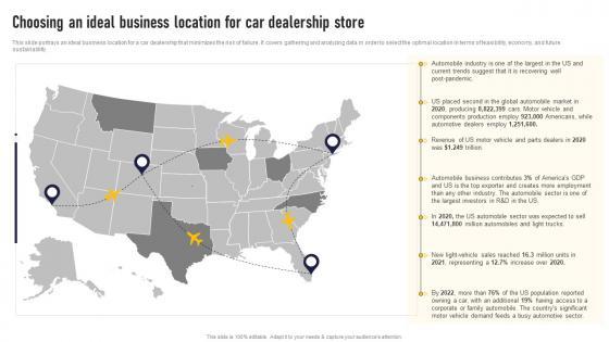 This slide portrays an ideal business location for a car dealership that minimizes the risk of failure. It covers gathering and analyzing data in order to select the optimal location in terms of feasibility, economy, and future sustainability. Slidegeeks has constructed Choosing An Ideal Business Location For Car Dealership Auto Dealership Business Plan Brochure Pdf after conducting extensive research and examination. These presentation templates are constantly being generated and modified based on user preferences and critiques from editors. Here, you will find the most attractive templates for a range of purposes while taking into account ratings and remarks from users regarding the content. This is an excellent jumping-off point to explore our content and will give new users an insight into our top-notch PowerPoint Templates. This slide portrays an ideal business location for a car dealership that minimizes the risk of failure. It covers gathering and analyzing data in order to select the optimal location in terms of feasibility, economy, and future sustainability.