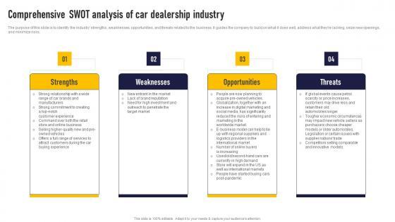 The purpose of this slide is to identify the industry strengths, weaknesses, opportunities, and threats related to the business. It guides the company to build on what it does well, address what theyre lacking, seize new openings, and minimize risks. This Comprehensive Swot Analysis Of Car Dealership Industry Auto Dealership Business Plan Professional Pdf from Slidegeeks makes it easy to present information on your topic with precision. It provides customization options, so you can make changes to the colors, design, graphics, or any other component to create a unique layout. It is also available for immediate download, so you can begin using it right away. Slidegeeks has done good research to ensure that you have everything you need to make your presentation stand out. Make a name out there for a brilliant performance. The purpose of this slide is to identify the industry strengths, weaknesses, opportunities, and threats related to the business. It guides the company to build on what it does well, address what theyre lacking, seize new openings, and minimize risks.
