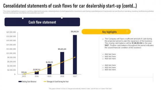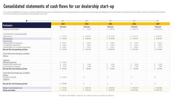 The slides highlight the companys cash flow statement to provide a detailed picture of what happened to a businesss cash during a specified period. It represents net cash flow from operating, investing, and financing activities from the historical year 2023 till the forecasted the year 2027. Take your projects to the next level with our ultimate collection of Consolidated Statements Of Cash Flows For Car Dealership Auto Dealership Business Plan Formats Pdf Slidegeeks has designed a range of layouts that are perfect for representing task or activity duration, keeping track of all your deadlines at a glance. Tailor these designs to your exact needs and give them a truly corporate look with your own brand colors they well make your projects stand out from the rest. The slides highlight the companys cash flow statement to provide a detailed picture of what happened to a businesss cash during a specified period. It represents net cash flow from operating, investing, and financing activities from the historical year 2023 till the forecasted the year 2027.