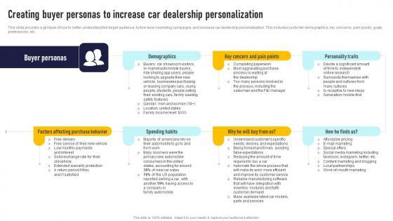 This slide provides a glimpse of how to better understand the target audience, to fine-tune marketing campaigns, and increase car dealership personalization. This includes customer demographics, key concerns, pain points, goals, preferences, etc. Do you know about Slidesgeeks Creating Buyer Personas To Increase Car Dealership Auto Dealership Business Plan Download Pdf These are perfect for delivering any kind od presentation. Using it, create PowerPoint presentations that communicate your ideas and engage audiences. Save time and effort by using our pre-designed presentation templates that are perfect for a wide range of topic. Our vast selection of designs covers a range of styles, from creative to business, and are all highly customizable and easy to edit. Download as a PowerPoint template or use them as Google Slides themes. This slide provides a glimpse of how to better understand the target audience, to fine-tune marketing campaigns, and increase car dealership personalization. This includes customer demographics, key concerns, pain points, goals, preferences, etc.