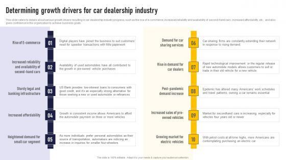 This slide caters to details about various growth drivers resulting in car dealership industry progress, such as the rise of e-commerce, increased reliability and availability of second-hand cars, increased affordability, etc., and also gives confidence in the organization to achieve business goals. Boost your pitch with our creative Determining Growth Drivers For Car Dealership Industry Auto Dealership Business Plan Diagrams Pdf Deliver an awe-inspiring pitch that will mesmerize everyone. Using these presentation templates you will surely catch everyones attention. You can browse the ppts collection on our website. We have researchers who are experts at creating the right content for the templates. So you do not have to invest time in any additional work. Just grab the template now and use them. This slide caters to details about various growth drivers resulting in car dealership industry progress, such as the rise of e-commerce, increased reliability and availability of second-hand cars, increased affordability, etc., and also gives confidence in the organization to achieve business goals.