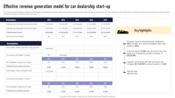 The slide shows the effective revenue model of the car dealership industry, which displays the cost incurred and the various sources of income. The revenue is calculated based on the percentage of the population captured by the company from the year 2023 to the year 2027. Want to ace your presentation in front of a live audience Our Effective Revenue Generation Model For Car Dealership Auto Dealership Business Plan Pictures Pdf can help you do that by engaging all the users towards you. Slidegeeks experts have put their efforts and expertise into creating these impeccable powerpoint presentations so that you can communicate your ideas clearly. Moreover, all the templates are customizable, and easy-to-edit and downloadable. Use these for both personal and commercial use. The slide shows the effective revenue model of the car dealership industry, which displays the cost incurred and the various sources of income. The revenue is calculated based on the percentage of the population captured by the company from the year 2023 to the year 2027.