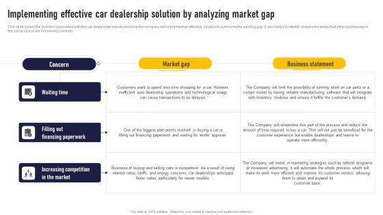 This slide covers the problem associated with the car dealership industry and how the company will implement an effective solution to overcome the existing gap. It also helps to identify unexplored areas that other businesses in the same space are not serving currently. Do you have to make sure that everyone on your team knows about any specific topic I yes, then you should give Implementing Effective Car Dealership Solution Auto Dealership Business Plan Guidelines Pdf a try. Our experts have put a lot of knowledge and effort into creating this impeccable Implementing Effective Car Dealership Solution Auto Dealership Business Plan Guidelines Pdf You can use this template for your upcoming presentations, as the slides are perfect to represent even the tiniest detail. You can download these templates from the Slidegeeks website and these are easy to edit. So grab these today. This slide covers the problem associated with the car dealership industry and how the company will implement an effective solution to overcome the existing gap. It also helps to identify unexplored areas that other businesses in the same space are not serving currently.