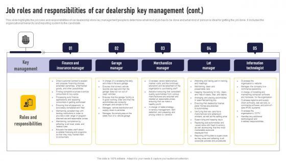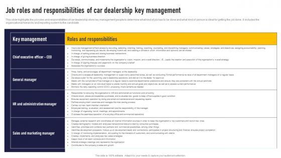 This slide highlights the job roles and responsibilities of car dealership store key management people to determine what kind of job has to be done and what kind of person is ideal for getting the job done. It includes the organizational hierarchy and reporting system to the candidate. From laying roadmaps to briefing everything in detail, our templates are perfect for you. You can set the stage with your presentation slides. All you have to do is download these easy-to-edit and customizable templates. Job Roles And Responsibilities Of Car Dealership Auto Dealership Business Plan Microsoft Pdf will help you deliver an outstanding performance that everyone would remember and praise you for. Do download this presentation today. This slide highlights the job roles and responsibilities of car dealership store key management people to determine what kind of job has to be done and what kind of person is ideal for getting the job done. It includes the organizational hierarchy and reporting system to the candidate.