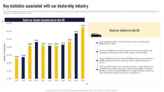 This slide highlights the thorough assessment of a market within the car dealership industry. It will help in getting valuable insights and project the success that the company expects while introducing its brand and its products and services to consumers within the market. Whether you have daily or monthly meetings, a brilliant presentation is necessary. Key Statistics Associated With Car Dealership Industry Auto Dealership Business Plan Mockup Pdf can be your best option for delivering a presentation. Represent everything in detail using Key Statistics Associated With Car Dealership Industry Auto Dealership Business Plan Mockup Pdf and make yourself stand out in meetings. The template is versatile and follows a structure that will cater to your requirements. All the templates prepared by Slidegeeks are easy to download and edit. Our research experts have taken care of the corporate themes as well. So, give it a try and see the results. This slide highlights the thorough assessment of a market within the car dealership industry. It will help in getting valuable insights and project the success that the company expects while introducing its brand and its products and services to consumers within the market.