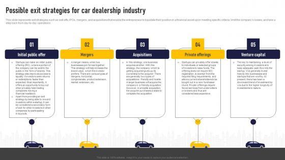 This slide represents exit strategies such as sell-offs, IPOs, mergers, and acquisitions that enable the entrepreneur to liquidate their position in a financial asset upon meeting specific criteria, limit the companys losses, and take a step back from day-to-day operations. If your project calls for a presentation, then Slidegeeks is your go-to partner because we have professionally designed, easy-to-edit templates that are perfect for any presentation. After downloading, you can easily edit Possible Exit Strategies For Car Dealership Industry Auto Dealership Business Plan Topics Pdf and make the changes accordingly. You can rearrange slides or fill them with different images. Check out all the handy templates This slide represents exit strategies such as sell-offs, IPOs, mergers, and acquisitions that enable the entrepreneur to liquidate their position in a financial asset upon meeting specific criteria, limit the companys losses, and take a step back from day-to-day operations.
