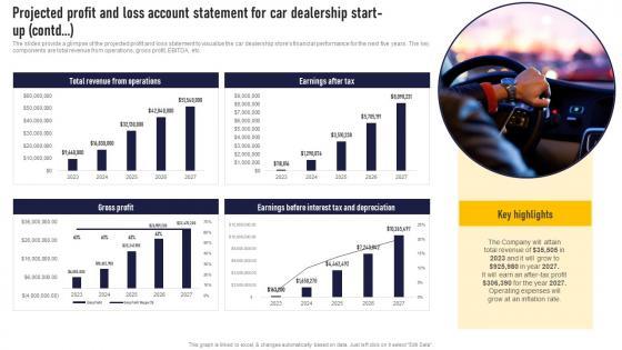 The slides provide a glimpse of the projected profit and loss statement to visualize the car dealership stores financial performance for the next five years. The key components are total revenue from operations, gross profit, EBITDA, etc. Crafting an eye-catching presentation has never been more straightforward. Let your presentation shine with this tasteful yet straightforward Projected Profit And Loss Account Statement For Car Auto Dealership Business Plan Ideas Pdf template. It offers a minimalistic and classy look that is great for making a statement. The colors have been employed intelligently to add a bit of playfulness while still remaining professional. Construct the ideal Projected Profit And Loss Account Statement For Car Auto Dealership Business Plan Ideas Pdf that effortlessly grabs the attention of your audience. Begin now and be certain to wow your customers. The slides provide a glimpse of the projected profit and loss statement to visualize the car dealership stores financial performance for the next five years. The key components are total revenue from operations, gross profit, EBITDA, etc.