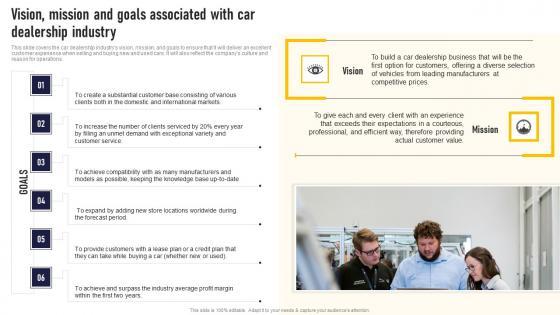 This slide covers the car dealership industrys vision, mission, and goals to ensure that it will deliver an excellent customer experience when selling and buying new and used cars. It will also reflect the companys culture and reason for operations. This Vision Mission And Goals Associated With Car Auto Dealership Business Plan Brochure Pdf is perfect for any presentation, be it in front of clients or colleagues. It is a versatile and stylish solution for organizing your meetings. The Vision Mission And Goals Associated With Car Auto Dealership Business Plan Brochure Pdf features a modern design for your presentation meetings. The adjustable and customizable slides provide unlimited possibilities for acing up your presentation. Slidegeeks has done all the homework before launching the product for you. So, do not wait, grab the presentation templates today This slide covers the car dealership industrys vision, mission, and goals to ensure that it will deliver an excellent customer experience when selling and buying new and used cars. It will also reflect the companys culture and reason for operations.
