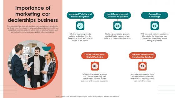 This purpose of the slide is to highlight the importance of marketing for car dealerships. It emphasizes how marketing initiatives support brand recognition, promote customer action, foster a culture of beauty, and aid dealerships in remaining competitive in the marketplace. Get a simple yet stunning designed Importance Of Marketing Car Go To Marketing Plan For Car Dealerships Demonstration Pdf. It is the best one to establish the tone in your meetings. It is an excellent way to make your presentations highly effective. So, download this PPT today from Slidegeeks and see the positive impacts. Our easy-to-edit Importance Of Marketing Car Go To Marketing Plan For Car Dealerships Demonstration Pdf can be your go-to option for all upcoming conferences and meetings. So, what are you waiting for Grab this template today. This purpose of the slide is to highlight the importance of marketing for car dealerships. It emphasizes how marketing initiatives support brand recognition, promote customer action, foster a culture of beauty, and aid dealerships in remaining competitive in the marketplace.