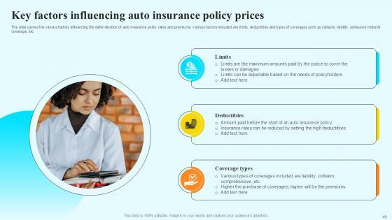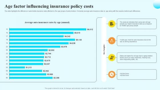 The slide highlights the difference in automobile insurance rates affected by the age groups of policyholders. It includes average auto insurance rates by age along with the reasons behind such differences. Boost your pitch with our creative Age Factor Influencing Insurance Steps By Step Guide For Claiming Car PPT PowerPoint. Deliver an awe-inspiring pitch that will mesmerize everyone. Using these presentation templates you will surely catch everyones attention. You can browse the ppts collection on our website. We have researchers who are experts at creating the right content for the templates. So you do not have to invest time in any additional work. Just grab the template now and use them. The slide highlights the difference in automobile insurance rates affected by the age groups of policyholders. It includes average auto insurance rates by age along with the reasons behind such differences.