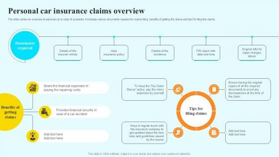 The slide carries an overview of personal car in case of accidents. It includes various documents required for claims filing, benefits of getting the claims and tips for filing the claims. Here you can discover an assortment of the finest PowerPoint and Google Slides templates. With these templates, you can create presentations for a variety of purposes while simultaneously providing your audience with an eye-catching visual experience. Download Personal Car Insurance Claims Steps By Step Guide For Claiming Car PPT Presentation to deliver an impeccable presentation. These templates will make your job of preparing presentations much quicker, yet still, maintain a high level of quality. Slidegeeks has experienced researchers who prepare these templates and write high-quality content for you. Later on, you can personalize the content by editing the Personal Car Insurance Claims Steps By Step Guide For Claiming Car PPT Presentation. The slide carries an overview of personal car in case of accidents. It includes various documents required for claims filing, benefits of getting the claims and tips for filing the claims.