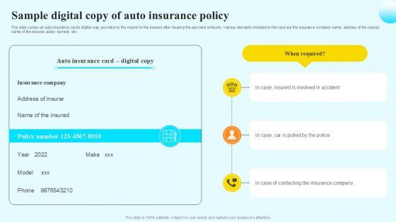 The slide carries an auto insurance cards digital copy provided by the insurer to the insured after clearing the payment amounts. Various elements included in the card are the insurance company name, address of the insurer, name of the insured, policy number, etc. Do you know about Slidesgeeks Sample Digital Copy Of Auto Insurance Steps By Step Guide For Claiming Car PPT Presentation These are perfect for delivering any kind od presentation. Using it, create PowerPoint presentations that communicate your ideas and engage audiences. Save time and effort by using our pre-designed presentation templates that are perfect for a wide range of topic. Our vast selection of designs covers a range of styles, from creative to business, and are all highly customizable and easy to edit. Download as a PowerPoint template or use them as Google Slides themes. The slide carries an auto insurance cards digital copy provided by the insurer to the insured after clearing the payment amounts. Various elements included in the card are the insurance company name, address of the insurer, name of the insured, policy number, etc.