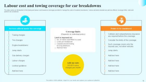 The slide highlights the multiple types f coverages provided by the insurance company to the policyholders for managing the damages. Various types included are comprehensive, collision, motorist, medical payments, liability, labour and towing coverages. Find highly impressive Different Types Of Auto Insurance Steps By Step Guide For Claiming Car PPT Slide on Slidegeeks to deliver a meaningful presentation. You can save an ample amount of time using these presentation templates. No need to worry to prepare everything from scratch because Slidegeeks experts have already done a huge research and work for you. You need to download Different Types Of Auto Insurance Steps By Step Guide For Claiming Car PPT Slide for your upcoming presentation. All the presentation templates are 100 percent editable and you can change the color and personalize the content accordingly. Download now The slide highlights the multiple types f coverages provided by the insurance company to the policyholders for managing the damages. Various types included are comprehensive, collision, motorist, medical payments, liability, labour and towing coverages.