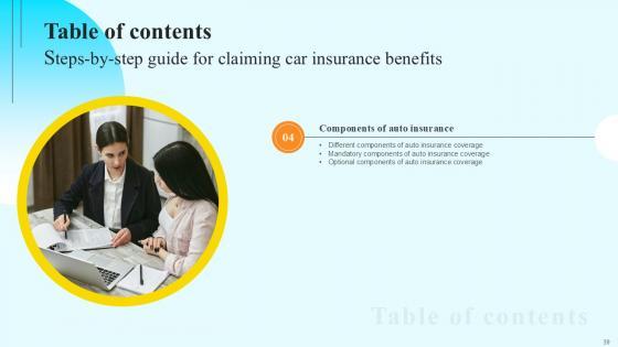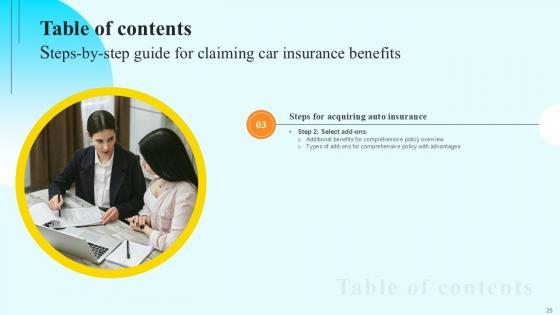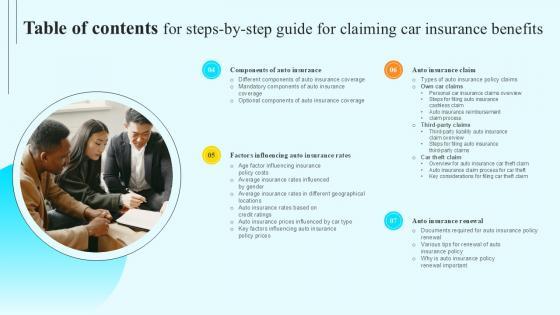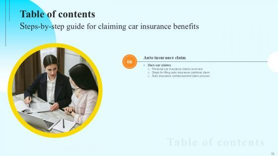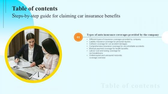 Retrieve professionally designed Table Of Contents For Steps By Step Guide For Claiming Car Insurance Benefits PPT Presentation to effectively convey your message and captivate your listeners. Save time by selecting pre-made slideshows that are appropriate for various topics, from business to educational purposes. These themes come in many different styles, from creative to corporate, and all of them are easily adjustable and can be edited quickly. Access them as PowerPoint templates or as Google Slides themes. You do not have to go on a hunt for the perfect presentation because Slidegeeks got you covered from everywhere. Our Table Of Contents For Steps By Step Guide For Claiming Car Insurance Benefits PPT Presentation are topically designed to provide an attractive backdrop to any subject. Use them to look like a presentation pro.
