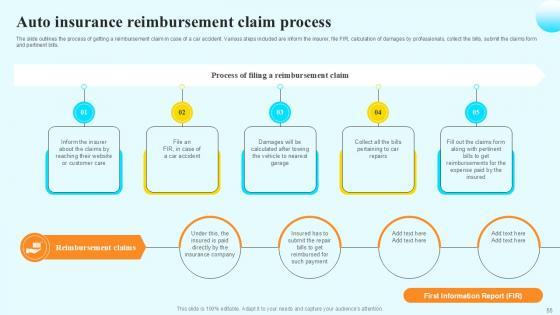 The slide outlines the process of getting a reimbursement claim in case of a car accident. Various steps included are inform the insurer, file FIR, calculation of damages by professionals, collect the bills, submit the claims form and pertinent bills. Do you have to make sure that everyone on your team knows about any specific topic I yes, then you should give Auto Insurance Reimbursement Steps By Step Guide For Claiming Car PPT Example a try. Our experts have put a lot of knowledge and effort into creating this impeccable Auto Insurance Reimbursement Steps By Step Guide For Claiming Car PPT Example. You can use this template for your upcoming presentations, as the slides are perfect to represent even the tiniest detail. You can download these templates from the Slidegeeks website and these are easy to edit. So grab these today The slide outlines the process of getting a reimbursement claim in case of a car accident. Various steps included are inform the insurer, file FIR, calculation of damages by professionals, collect the bills, submit the claims form and pertinent bills.