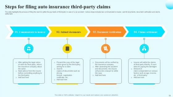 The slide highlights the process of filing the claim to settle the payments of third-party in case of a car accident. Various steps included are communicate to insurer, submit documents, document verification and claims settlement. The best PPT templates are a great way to save time, energy, and resources. Slidegeeks have 100 percent editable powerpoint slides making them incredibly versatile. With these quality presentation templates, you can create a captivating and memorable presentation by combining visually appealing slides and effectively communicating your message. Download Steps For Filing Auto Insurance Third Steps By Step Guide For Claiming Car PPT Presentation from Slidegeeks and deliver a wonderful presentation. The slide highlights the process of filing the claim to settle the payments of third-party in case of a car accident. Various steps included are communicate to insurer, submit documents, document verification and claims settlement.