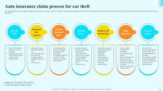 The slide illustrates various steps of getting auto insurance claims in case of car theft. Various steps included are file an FIR, intimate the insurer, inform transport office, fill the form, submit the documents, claim approval and get the claims. Slidegeeks is one of the best resources for PowerPoint templates. You can download easily and regulate Auto Insurance Claim Process Steps By Step Guide For Claiming Car PPT PowerPoint for your personal presentations from our wonderful collection. A few clicks is all it takes to discover and get the most relevant and appropriate templates. Use our Templates to add a unique zing and appeal to your presentation and meetings. All the slides are easy to edit and you can use them even for advertisement purposes. The slide illustrates various steps of getting auto insurance claims in case of car theft. Various steps included are file an FIR, intimate the insurer, inform transport office, fill the form, submit the documents, claim approval and get the claims.